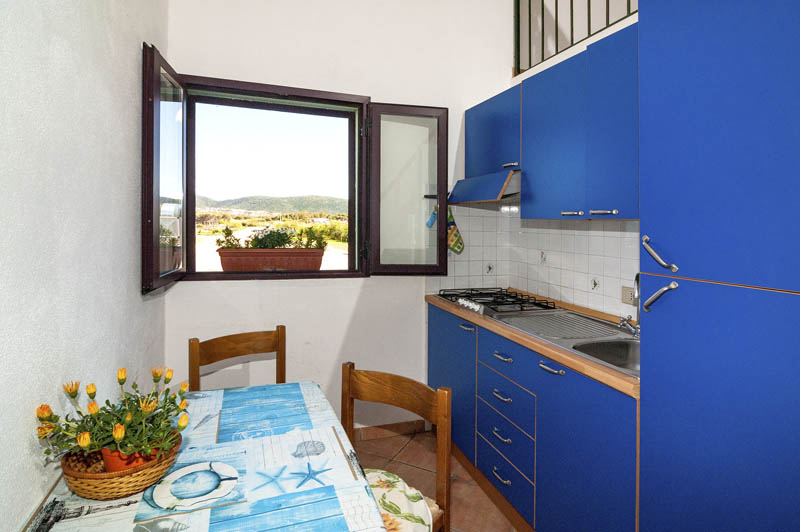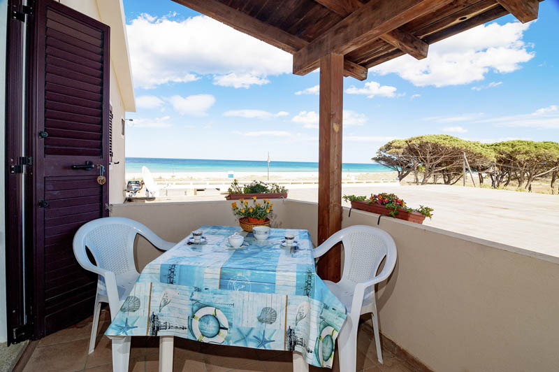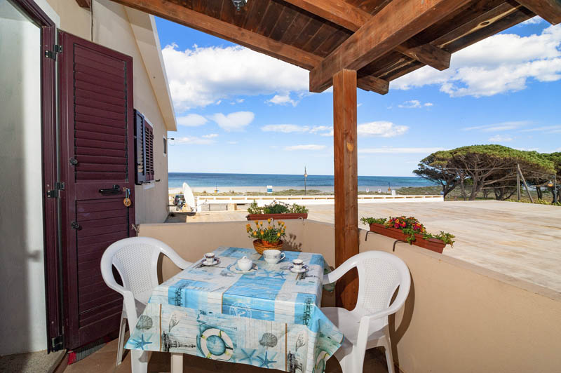 Situato al piano primo, l’appartamento è composto da una camera da letto matrimoniale con armadio, un soppalco con due letti singoli, un bagno con doccia, un soggiorno con cucina e tavolo da pranzo.. Dispone di un tavolo e sedie da esterno da utilizzare in una veranda laterale indipendente con vista mare. L'accesso si ha da una veranda in comune frontemare con scala a chiocciola