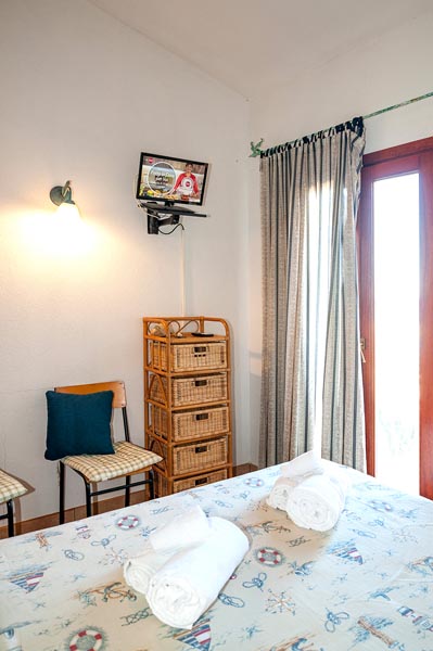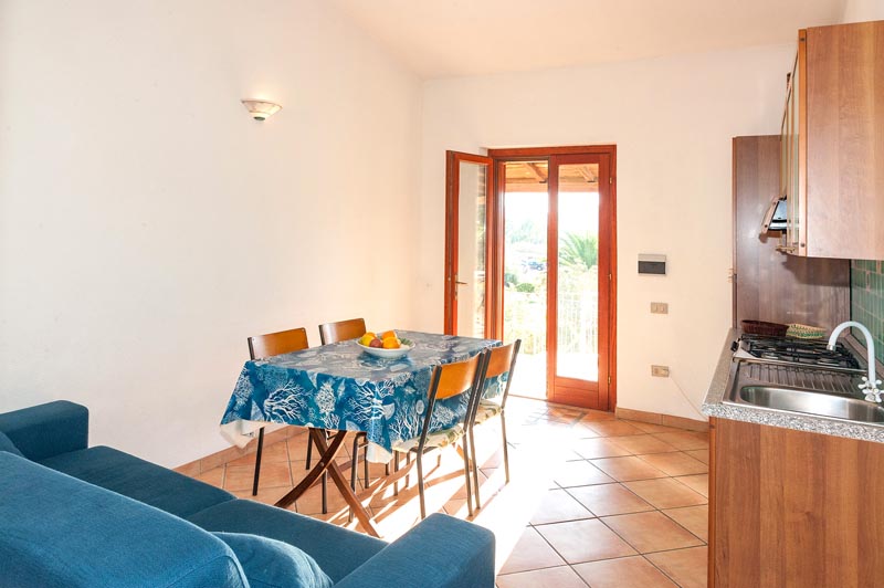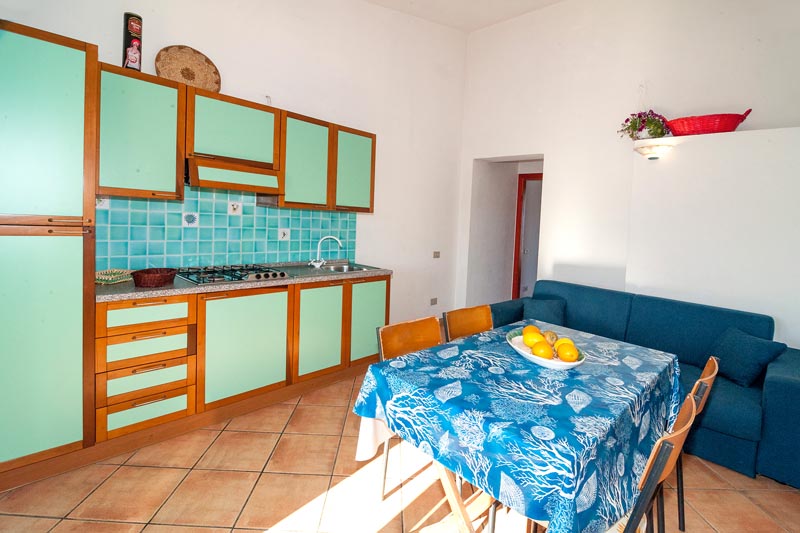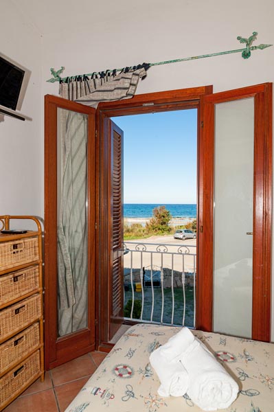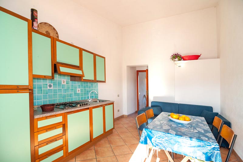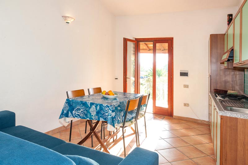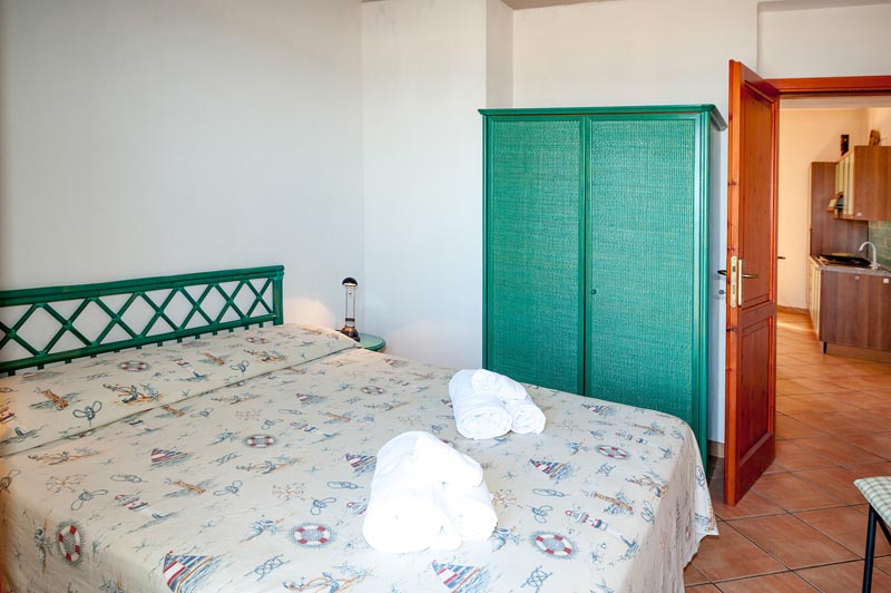 Situato al piano primo, l’appartamento è composto da una camera da letto matrimoniale con armadio e balconcino vista mare, un divano letto, un bagno con doccia, un soggiorno con cucina e tavolo da pranzo.. Dispone di un tavolo e sedie da esterno da utilizzare in una veranda in comune fronte cortile interno..